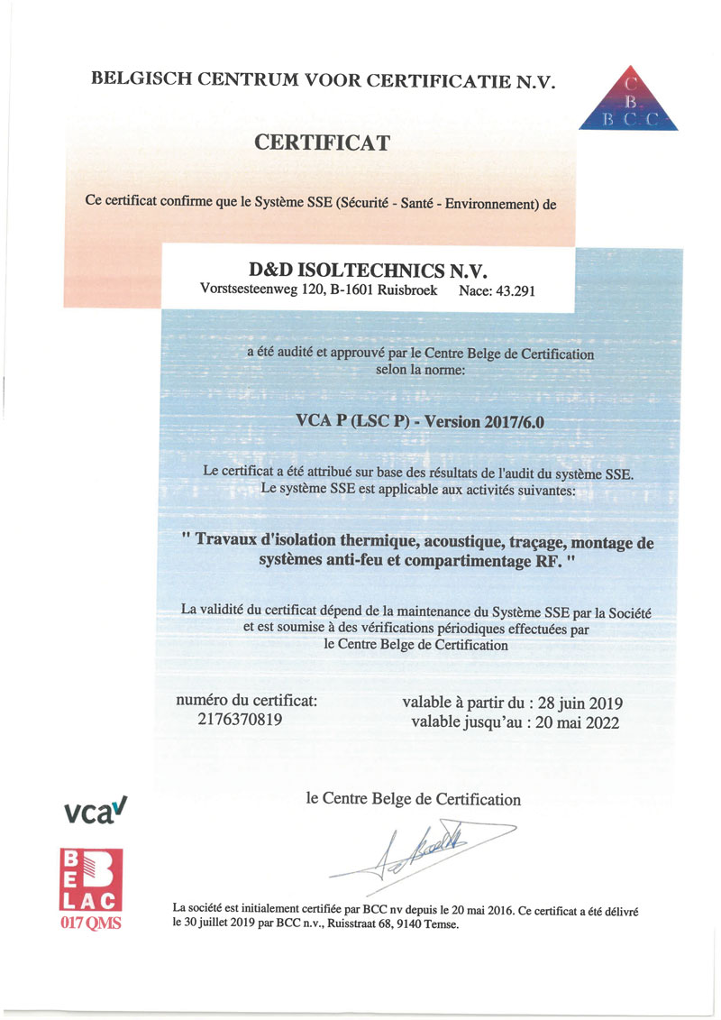 CERTIFICAT Ce certificat confirme que le Système SSE (Sécurité - Santé - Environnement) de D&D ISOLTECHNICS N.V. Vorstsesteenweg 120, B-1601 Ruisbroek Nace: 43.291 a été audité et approuvé par le Centre Belge de Certification selon la norme: VCA P (LSC P) - Version 2008/5.1 Le certificat a été attribué sur base des résultats de l'audit du système SSE. Le système SSE est applicable aux activités suivantes: " Travaux d'isolation thermique, acoustique, traçage, montage de systèmes anti-feu et compartimentage RF, désamiantage. " La validité du certificat dépend de la maintenance du Système SSE par la Société et est soumise à des vérifications périodiques effectuées par le Centre Belge de Certification numéro du certificat date d'émission : 28 juin 2019 2176370819 date d'expiration : 20 mai 2022 le Centre Belge de Certification